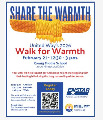 The United Way's Walk for Warmth is an event that raises funds for people in the Anchorage area who are struggling to pay their heating bills. Together, we can keep our community safe and warm. The event begins at 12:30 p.m. at Romig Middle School and follows a one mile loop toward Westchester Lagoon and back.